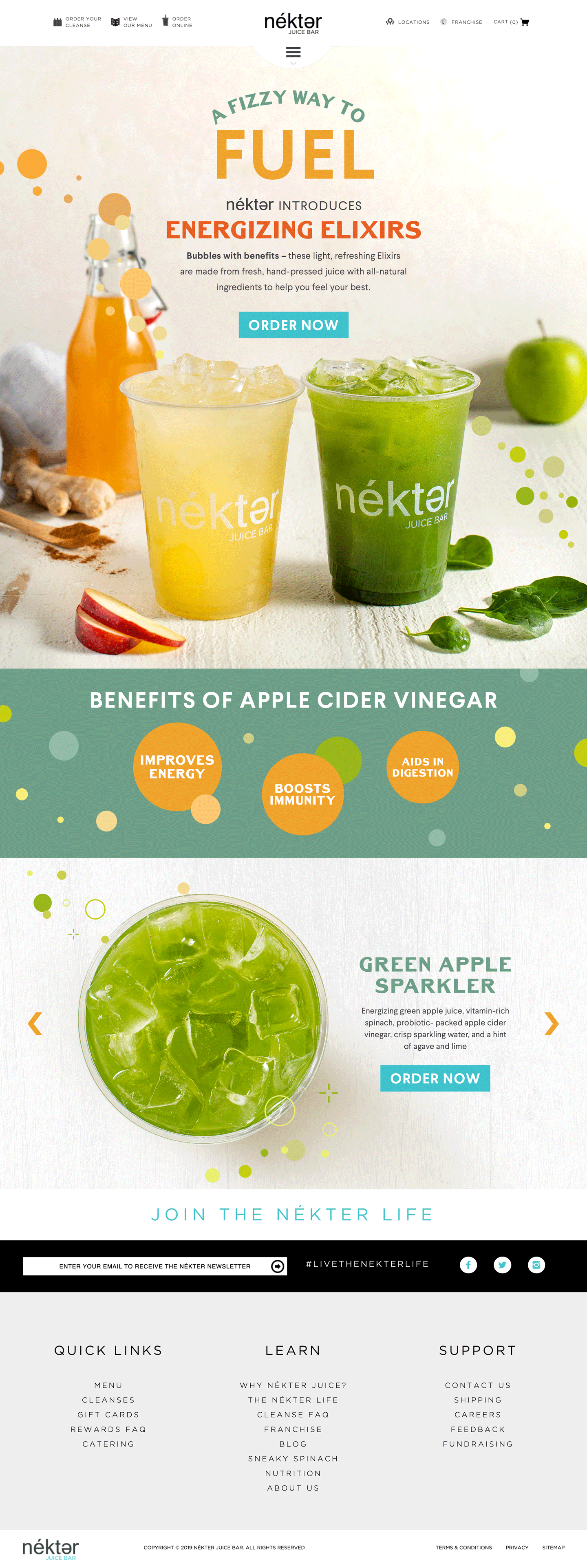 Featured are branded landing pages for Nékter, including local store pages and the launch of Energizing Elixirs. Each store page showcases key details like hours, a pinned map, and store-specific menus for a smooth, intuitive experience. Geolocation makes it easy for customers to find nearby locations. For Energizing Elixirs, I designed a fun, whimsical page with bubble GIFs to capture the fizzy, playful vibe of the drinks and reflect Nékter’s vibrant personality.